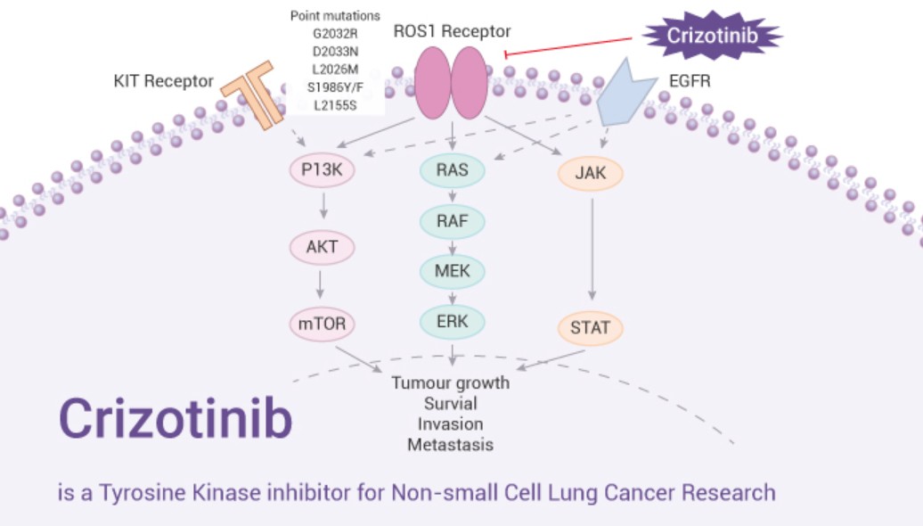 Crizotinib is an oral targeted therapy drug primarily used to treat non-small cell lung cancer (NSCLC). It belongs to a class of medications known as tyrosine kinase inhibitors (TKIs), which work by blocking specific enzymes that help cancer cells grow and spread. Crizotinib is most effective in patients whose lung cancer carries certain genetic changes, particularly ALK (anaplastic lymphoma kinase) rearrangements and ROS1 gene alterations.